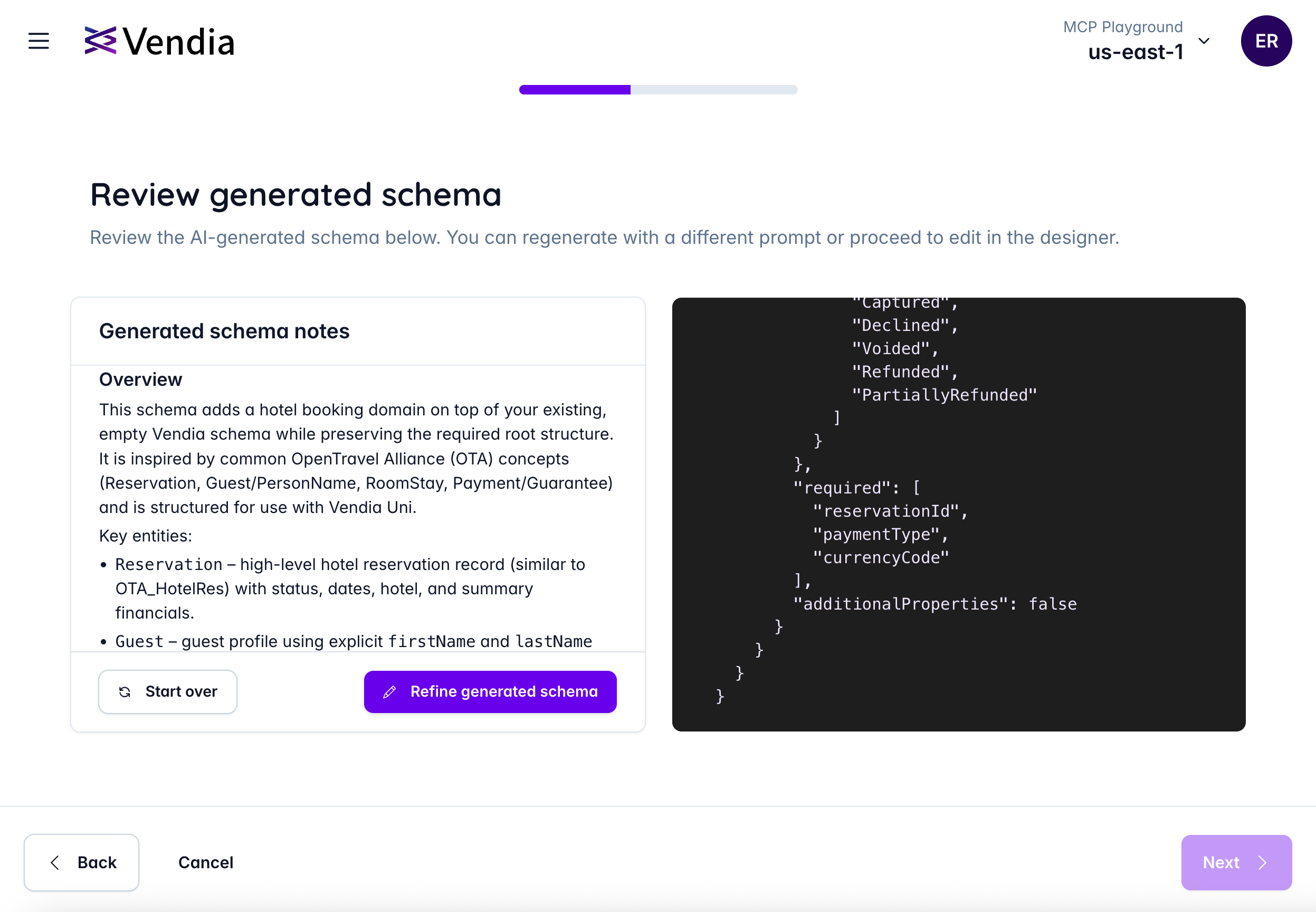 - Iterate and refine: Further refine or expand the schema using AI or, make manual adjustments using the Vendia JSON editor or Vendia UI for precise control.